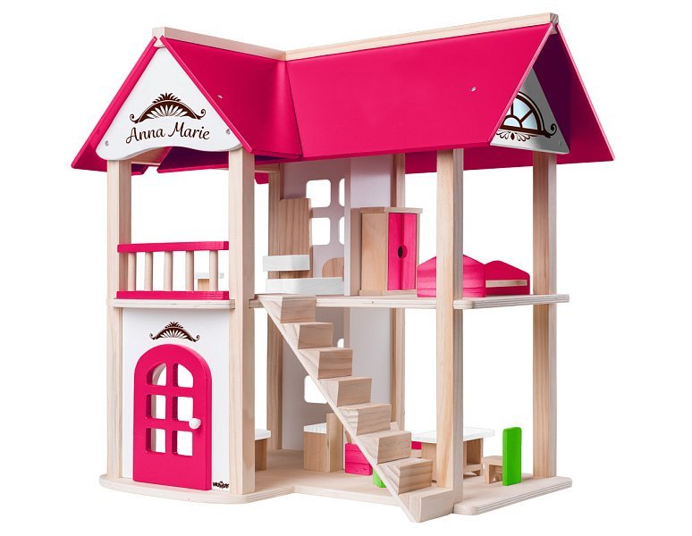 Villa Anna-Marie is a dollhouse designed by Czech designers under the Woody brand. It is a high-quality and well-designed product with a range of functional features. These include a magnetic removable balcony, a mobile staircase, and hinged doors. The dollhouse is open, making all its parts easily accessible. Villa Anna-Marie is made of solid wood, which is combined with fiberboard to lighten the overall structure of the villa. The package also includes 2 dolls, which have a total of 13 pieces of solid wood furniture available in all rooms. Suitable for children aged 3 and up. Product features: The villa is made of solid wood and fiberboard. The colors of Villa Anna-Marie are pink, white, and solid wood. It includes 2 dolls and 13 pieces of furniture. For children aged 3 and up.