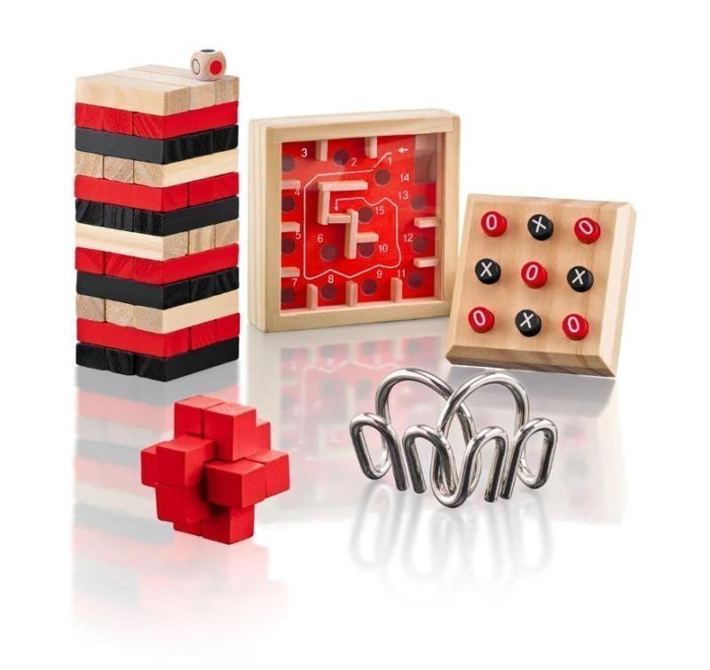 A set of mini games and puzzles made of wood/metal. Inside, you'll find not only miniatures of famous board games but also solutions to individual puzzles. However, first, test your wit, logic, and patience!