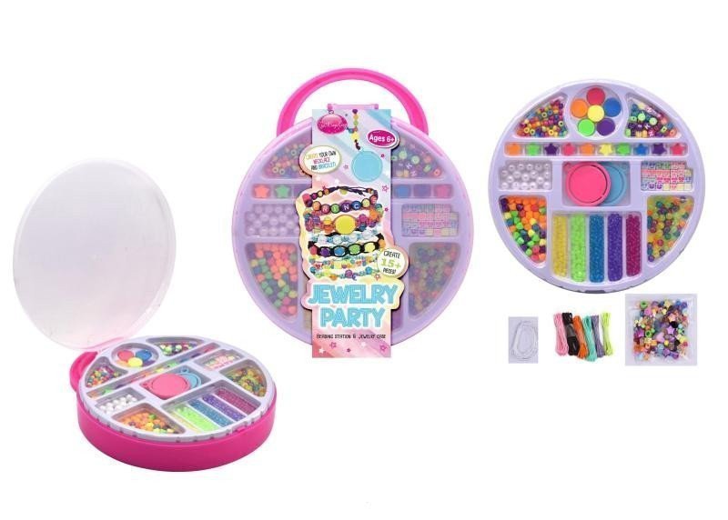 Bead kit for making your own bracelets and necklaces. The kit includes beads of various colors and shapes, and a string. Convenient packaging in a round case with a handle and divided compartments for beads. Suitable for children aged 6 and up.