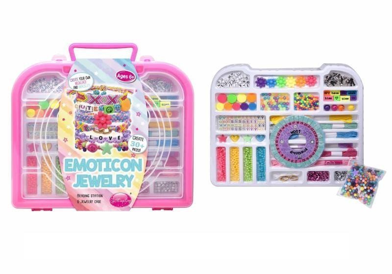 Large bead kit for making your own woven bracelets and necklaces. The kit includes beads of various colors and shapes, a string, and a round loom. Convenient packaging in a case with a handle and divided compartments for beads. Suitable for children aged 6 and up.