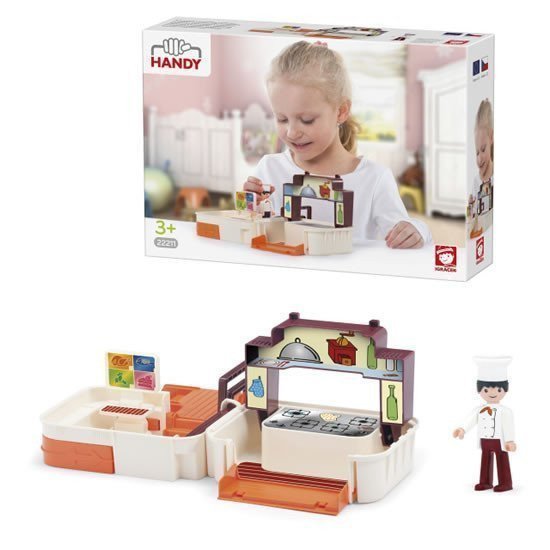 Cook with Igráček the chef a variety of delights in a beautiful restaurant with a large kitchen and an order terminal for perfect service. IGRÁČEK HANDY are practical foldable play environments that you can take with you anywhere. The original design without a traditional roof offers the child a new perspective and naturally develops spatial imagination. Made in the Czech Republic.