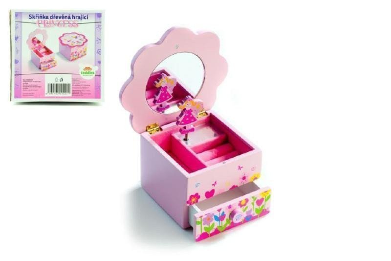 A pink wooden jewelry box with a flower-shaped lid featuring princesses and flowers. A small drawer for tiny treasures, with a compartment for rings under the lid, and a mirror for the little girl to see herself as she puts on her treasures. When the jewelry box is opened, a little fairy pops out, spins around, and plays a gentle melody. The mechanism is wind-up and does not require batteries. Size of the jewelry box: 10 x 10 x 8 cm. Suitable for girls aged 3 and up.