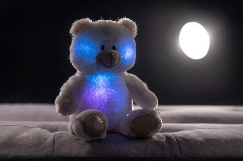 The cute plush teddy bear is made from high-quality soft plush. This plush piece is the perfect gift! The Dreamy Bear helps children fall asleep more easily. When you press its paw, it plays calming relaxing music for about 17 minutes. It glows in the dark and changes colors. Size of the bear: 40 cm. Suitable for children aged 3 and up.