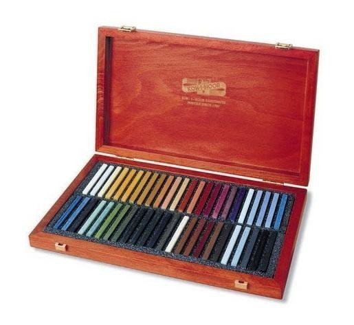 A set of 48 artistic hard square pastels measuring 7 x 7 x 75 mm packed in a wooden case. The pastels are intended for artistic and hobby drawing. They are strongly pigmented with high lightfastness and a smooth output.