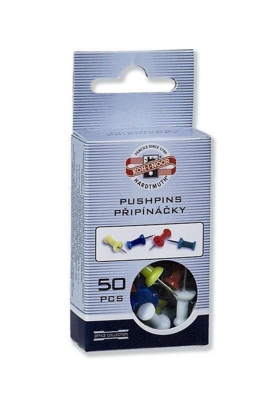 Push pins with a plastic holder, height 23 mm, diameter at the widest point 10 mm, plastic holder – mixed colors, metal tip, 50 pieces in a paper box. They are used to attach papers or objects, such as fabric and other lighter materials, to a corkboard.