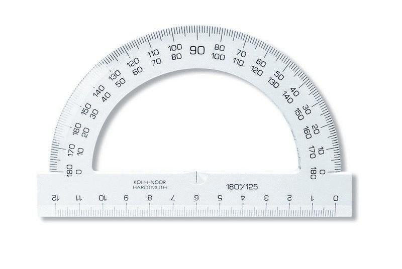Protractor 180/125 made of clear transparent polystyrene. The scales are printed using precise screen printing technology. The print of the scales is wear-resistant during normal use. In addition to the two protractor scales on the arc, a 120 mm long length scale is printed on the hypotenuse. The protractor is intended for drawing and technical drawing in school and office. It is packaged in a polyethylene bag with a euro hanger.