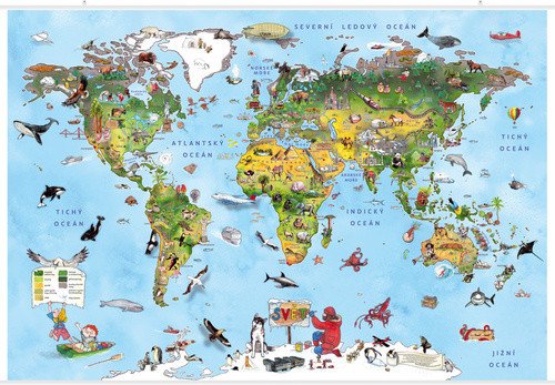 Do you want your little schoolboy or preschooler to have the world always in sight and to get to know it in a natural way? Then you won't find a better decoration for a child's room than our illustrated world map for little travelers. As you already know from our illustrated atlas, eight-year-old twins Anička and Kryštof decided one day to prepare a world atlas for little travelers like themselves. They set off on a long journey, during which they visited all the continents and shared their experiences and knowledge with their peers through engaging illustrations, a travel diary, and other notes. But that wasn't the end. Upon their return, they marked all the places they visited on a wall map, creating a hand-illustrated wall map that offers children an overview of animals, plants, monuments, and cities from all corners of the world. If you want to glean as much information as possible from the map, open the illustrated atlas, and you'll learn what each picture represents, including some interesting facts. Everything is written and drawn from the children's perspective, clearly and engagingly. The atlas and wall map are original, Czech, hand-painted works, and thanks to Anička and Kryštof, the information is tailored precisely for children. The set includes the atlas with the wall map...