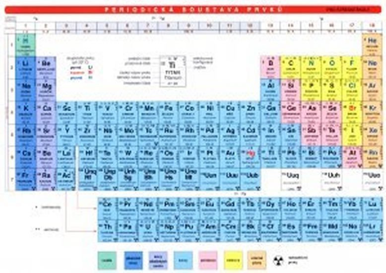 Designed for elementary schools. An essential tool for teaching chemistry. Thanks to the lower amount of data in the table, it achieves greater clarity and readability. The periodic table of elements represents the current number of discovered elements organized into a well-known table according to groups and periods. Each element is listed with its symbol, oxidation number, atomic mass number, proton number, Czech name, and Latin name. The states of matter, radioactivity, and distinctions between metals, alkali metals, alkaline earth metals, metalloids, nonmetals, and noble gases are color-coded. The reverse side of the table provides the proton number, symbol, electron configuration, and Latin name for each element. The table's advantage is the explanation of the structure according to groups and periods. The shells (horizontal rows of the table - periods) and vertical columns of elements in the periodic table, referred to as groups, are graphically illustrated and described regarding the structure of the atom and the electron shell.