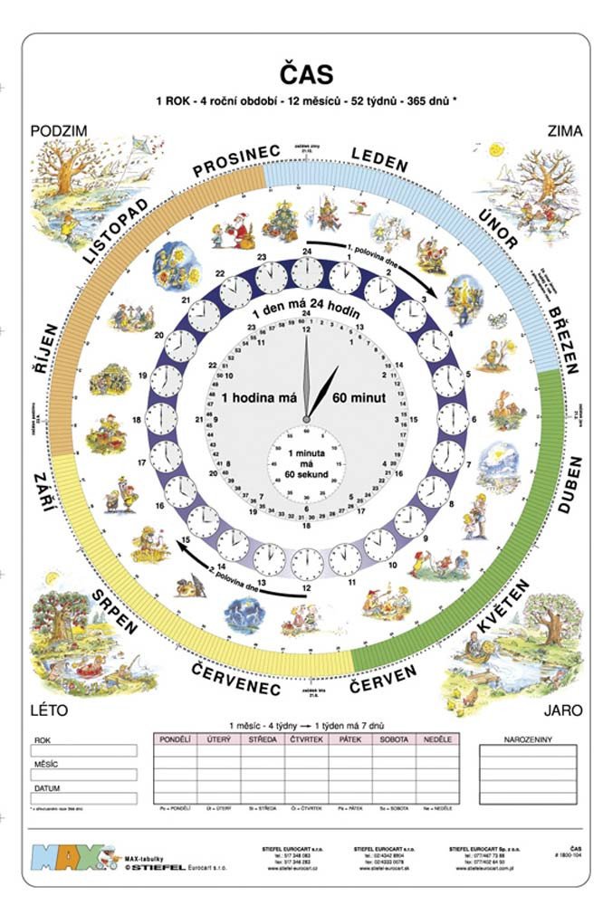 The content of the successful educational chart TIME is focused on mastering the material primarily in a light, playful manner that supports creative learning about hours, parts of the day, days of the week, months, and seasons... their sequence and characteristics. A significant part of the educational tool consists of illustrations and a circle that serves both as a clock and a basis for months and seasons. The back working side is used for practicing and further developing children's creativity and imagination.
