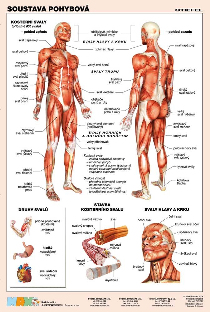 The didactic aid with the educational theme 'the structure of the body and the functions of individual organs of a human being' is dedicated to the musculoskeletal system. The content of the educational chart is divided into three parts: skeletal muscles and their structure, types of muscles, muscles of the head and neck. The back side is text-free and serves for practice and testing.