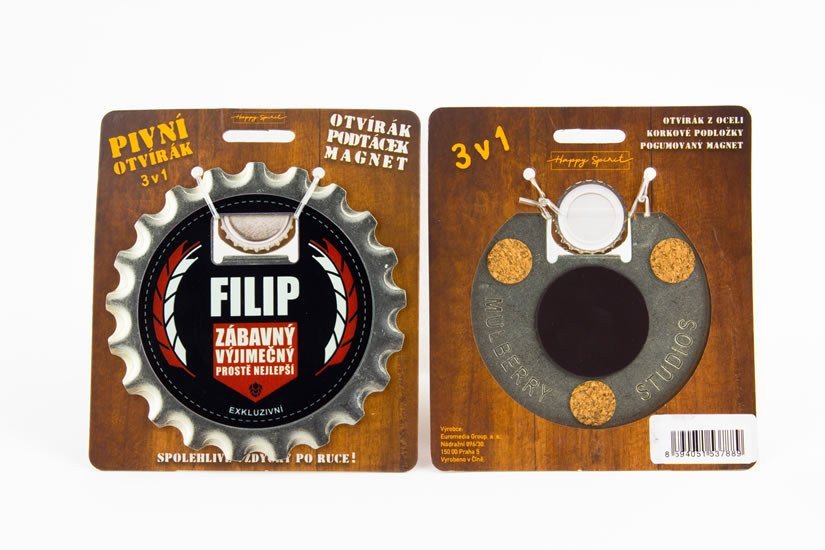 The bottle opener shaped like a large beer cap is a great choice for all lovers of the most traditional Czech beverage. It also surprises with additional options. Use it as a coaster, attach it to the fridge with a magnet. Delight the male ego with flattering inscriptions. With a wide selection of the most common male names and general family names, you can easily find the most suitable one for you.