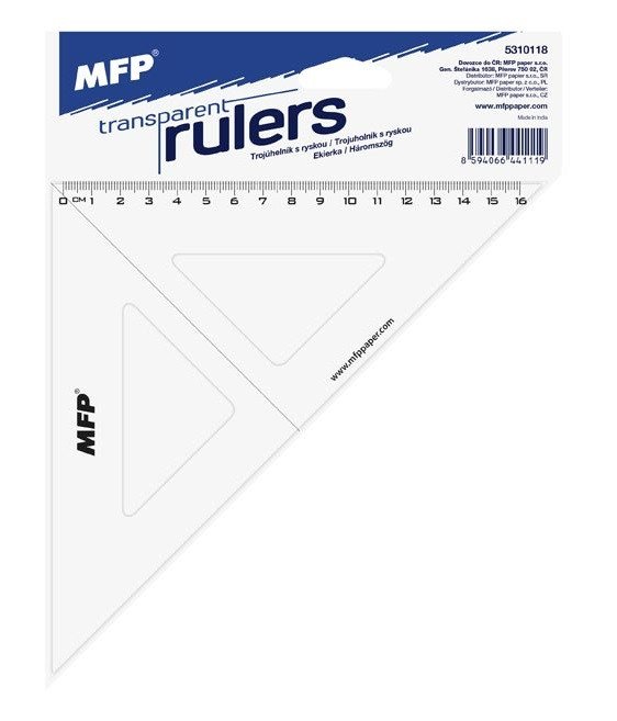 School plastic ruler right triangle with a scale, 16 cm long. The ruler forms angles of 45°/90°/45°.