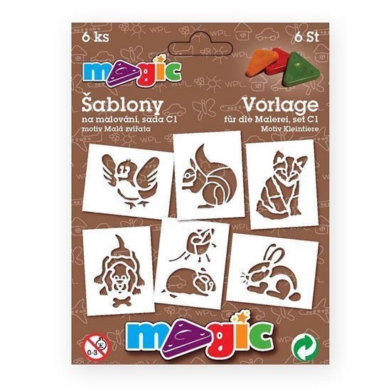 Set of 6 paper painting stencils. Material: white cardboard 220g. Recommended for painting with magic wax crayons (frottage technique), also suitable for dabbing with tempera paints, for painting with blow pens, or for modeling clay painting techniques. Dimensions: 11x14cm.