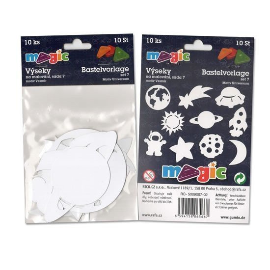 Set of 10 die-cut figures. Material: white cardboard 220g. Ideal for painting - frottage with magic wax crayons. Not suitable for children under 3 years, contains small parts. Dimensions of the images approximately 4cm x 7cm.
