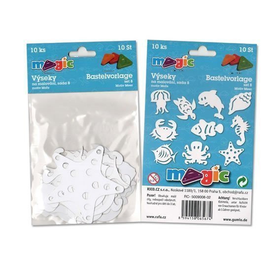 Set of 10 die-cut figures. Material: white cardboard 220g. Ideal for painting - frottage with magic wax crayons. Not suitable for children under 3 years, contains small parts. Dimensions of the images approximately 4cm x 7cm.