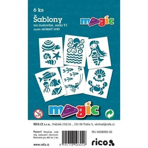 Set of 6 paper painting stencils. Material: white cardboard 220g. Recommended for painting with magic wax crayons (frottage technique), suitable for dabbing with tempera, for painting with blow pens, or for modeling clay painting techniques. Not suitable for children under 3 years, contains small parts. Dimensions: 11x14cm.