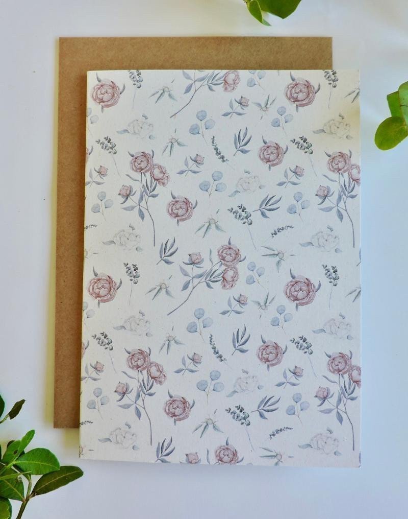 Be Nice Eco Card 'Eucalyptus with Peony' - featuring the original design of Czech peony and eucalyptus. The original designs on the card were created by Czech illustrator Bára from Nikolajka. Size: 12 x 17 cm.