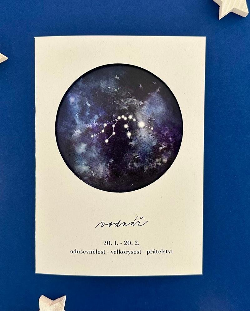 Be Nice EKO greeting card Zodiac Sign - Aquarius. Do you believe that zodiac signs are part of us and tell something about us? A beautiful card that carries the positive traits of the sign and is complemented by its own constellation. All this together with beautiful text and a unique design of a truly cosmic card. The card has a cut-out on the front cover. The card was illustrated by Czech artist Bára from Nikolajka. Size: 12 x 17 cm.