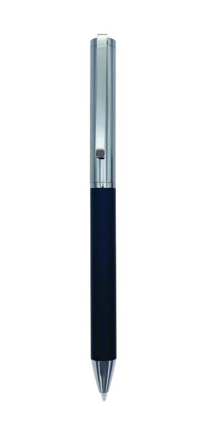 Metal ballpoint pen with a rotating mechanism in black. This pen features a metal clip and a rubber grip, ensuring comfortable writing. The nib width is 1.0 mm. Supplied in an elegant black box. Replacement refill Silver metal.