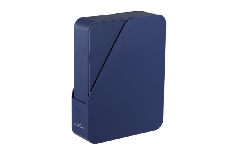 The compact desktop office set made from recycled materials includes 7 pieces of equipment in blue: a catalog stand (32.5 x 25 x 8 cm), a sticky note holder (11.8 x 10.5 x 6.5 cm), a pen holder (12.5 x 6.5 x 11.2 cm), a document holder (31.5 x 24 x 7 cm), two office supply organizers (12.5 x 10.5 x 6.5 cm), and a pen organizer (23 x 6.4 x 10.6 cm) with a removable grid, which can be used as a standalone organizer once removed. In 2022, the Lucky set was awarded the prestigious Red Dot Award for its exceptional design. This internationally recognized award confirms the creativity, functionality, and attractive design of the product. The raw materials used come from recycled office equipment. This process is monitored by GRS (Global Recycled Standard) guidelines, which aim to promote the use of recycled materials in production and minimize the damage associated with their extraction.