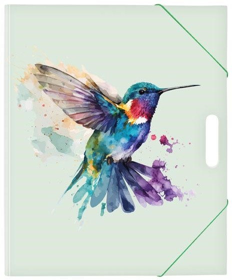 A drawing folder in green with a hummingbird design. It is made of high-quality cardboard covered with lamination. Inside the folder, there are corner holders for securing A4 drawings. The folder is equipped with an elastic band for secure closure and a cut-out for easy carrying. This way, the drawings remain intact.