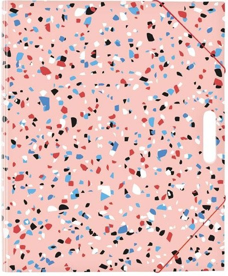 A folder for drawings in pink color with a design mimicking polished tiles with fine stones (terrazzo). It is made of high-quality cardboard, coated with laminate. Inside the folder, there are corners for securing A4 drawings. The folder is equipped with an elastic band for secure closure and a thumbhole for easy carrying. This way, the drawings remain intact.