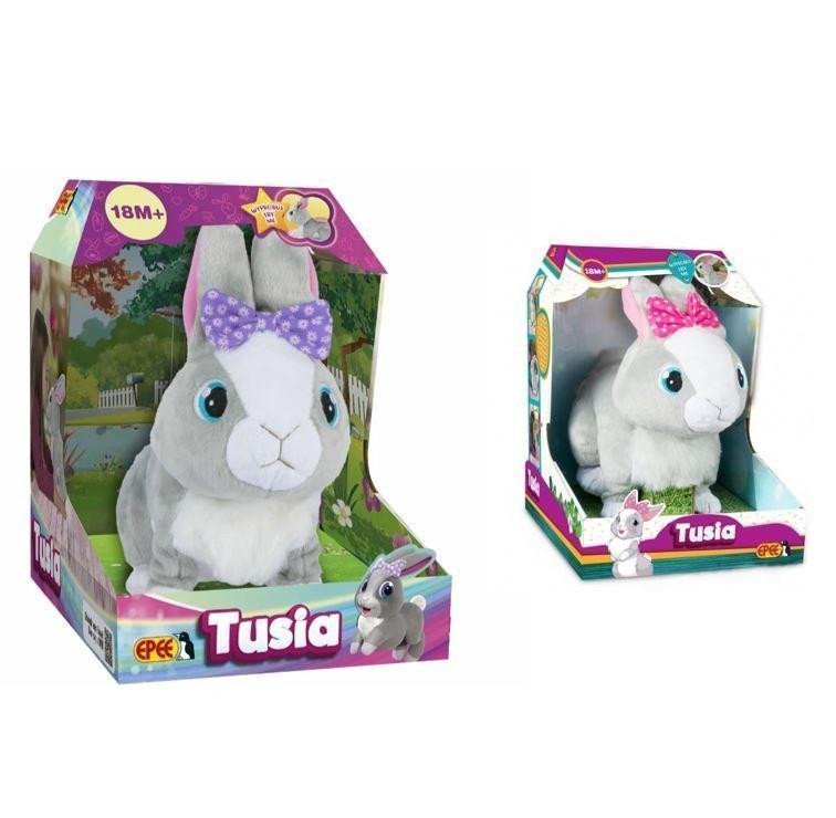 Interactive, plush bunny Bany. Bany reacts to sounds with movement and ear wiggling. But be careful if you call Bany too quietly. Or you might confuse her with too much noise, scare her, and she won't respond. The product requires 3 AA batteries and is suitable for children from 18 months. The bunny comes with a purple or pink bow. The color cannot be chosen; we send it randomly.