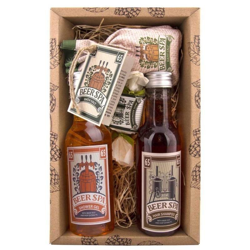 Gift set of beer cosmetics Beer Spa – shower gel 200 ml, bath foam 200 ml, soap 30 g, and bath salt 150 g. An original gift not just for men. Relax and create your own home beer spa.