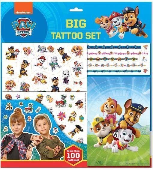 The set includes more than 100 colorful tattoos of various sizes and designs, along with a drawing notebook.