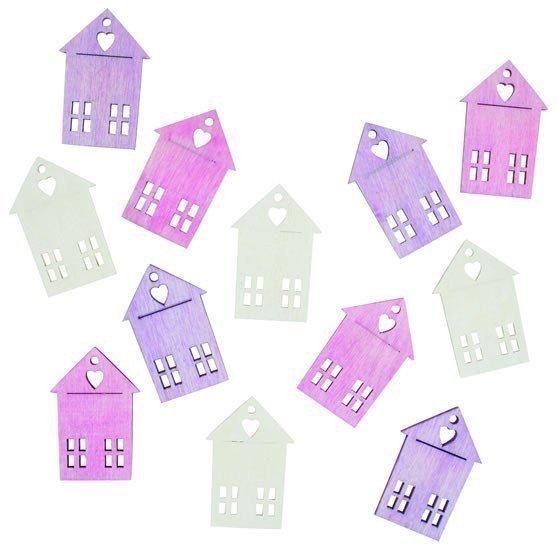 Wooden houses in pink, purple, and white are intended for creating decorations.