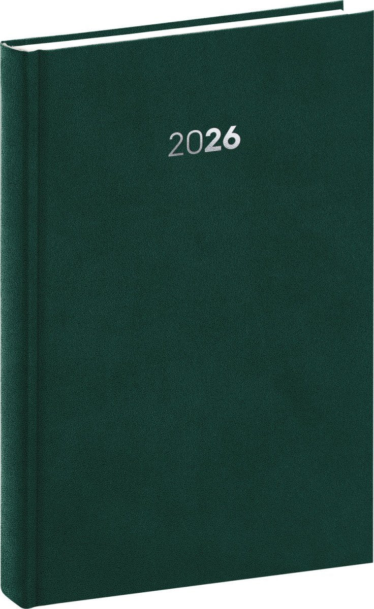 The Balakon 2026 daily planner in green, complemented by a silver year. The surface of the planner has gained popularity due to its high-quality outer material, which is extremely resistant to external damage. Daily schedule with Czech-Slovak calendar and additional English, German, Hungarian, and Russian.