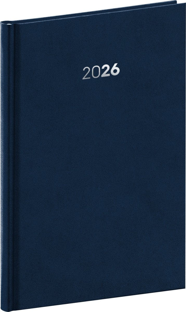 The Balakon 2026 weekly planner in dark blue, complemented by a silver year. The surface of the planner has gained popularity due to its high-quality outer material, which is extremely resistant to external damage. Weekly schedule with Czech-Slovak calendar and additional English, German, Hungarian, and Russian.