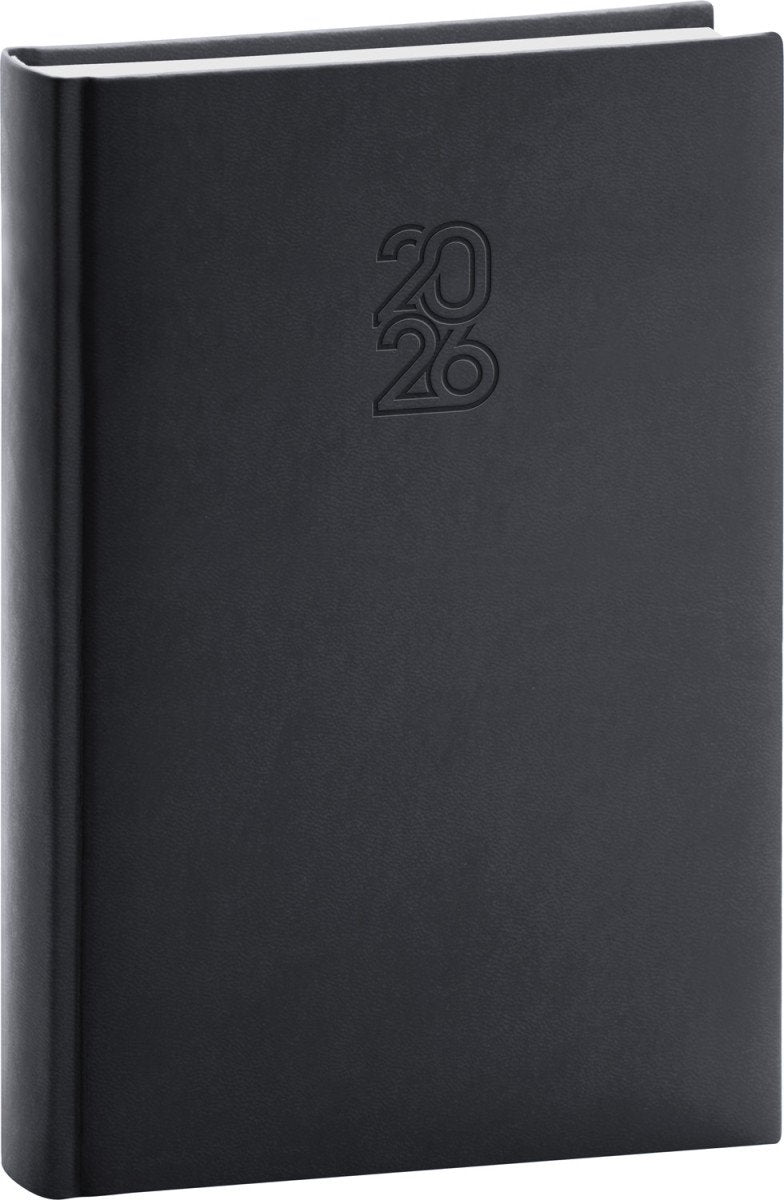 Daily planner Aprint 2026 in black. The collection relies on proven colors, complemented by a new embossing of the year. Daily schedule with Czech-Slovak calendar and additional English, German, Hungarian, and Russian.