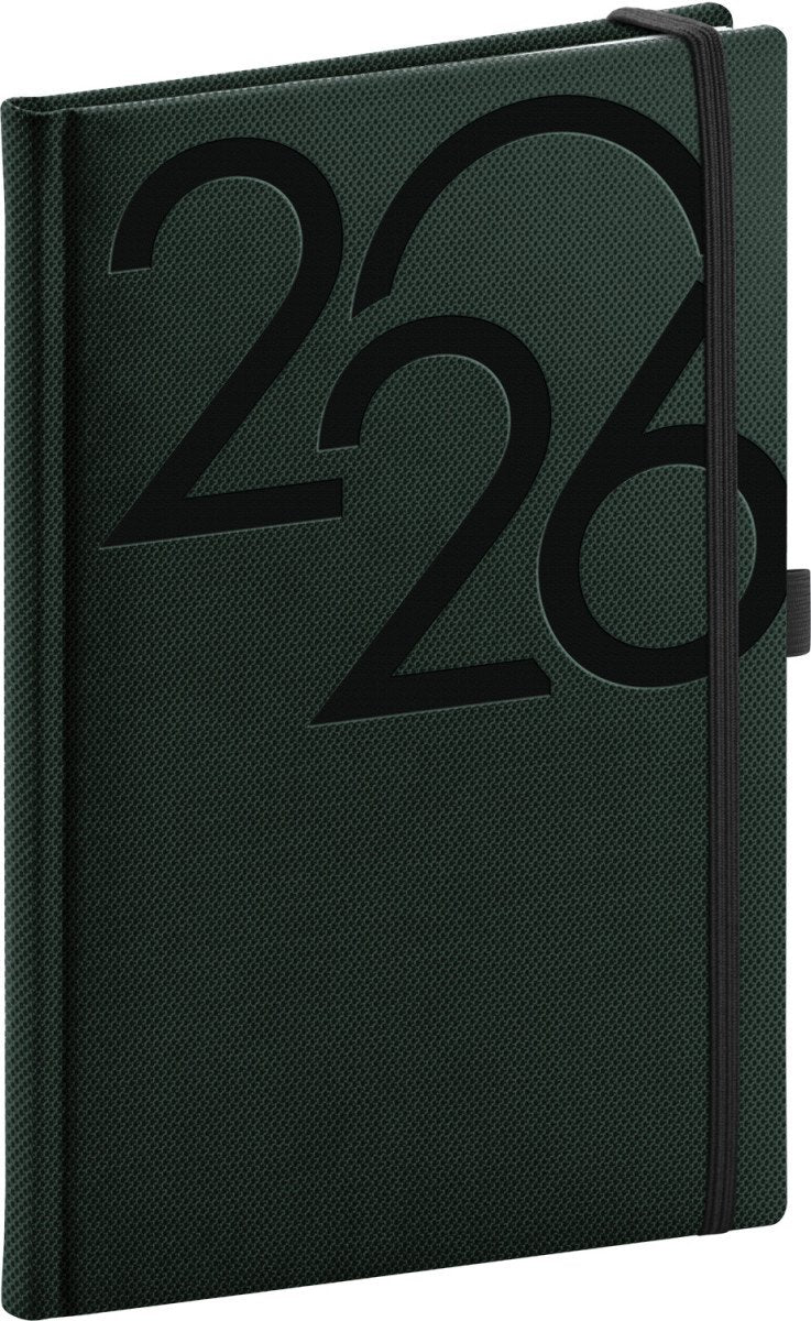 Weekly planner Ajax 2026 in green color. The finely structured surface with an atypical relief is suitable for all types of embossing. The planner has rounded corners, a pen loop, and an elastic band. Weekly schedule with Czech-Slovak calendar and additional English, German, Hungarian, and Russian.