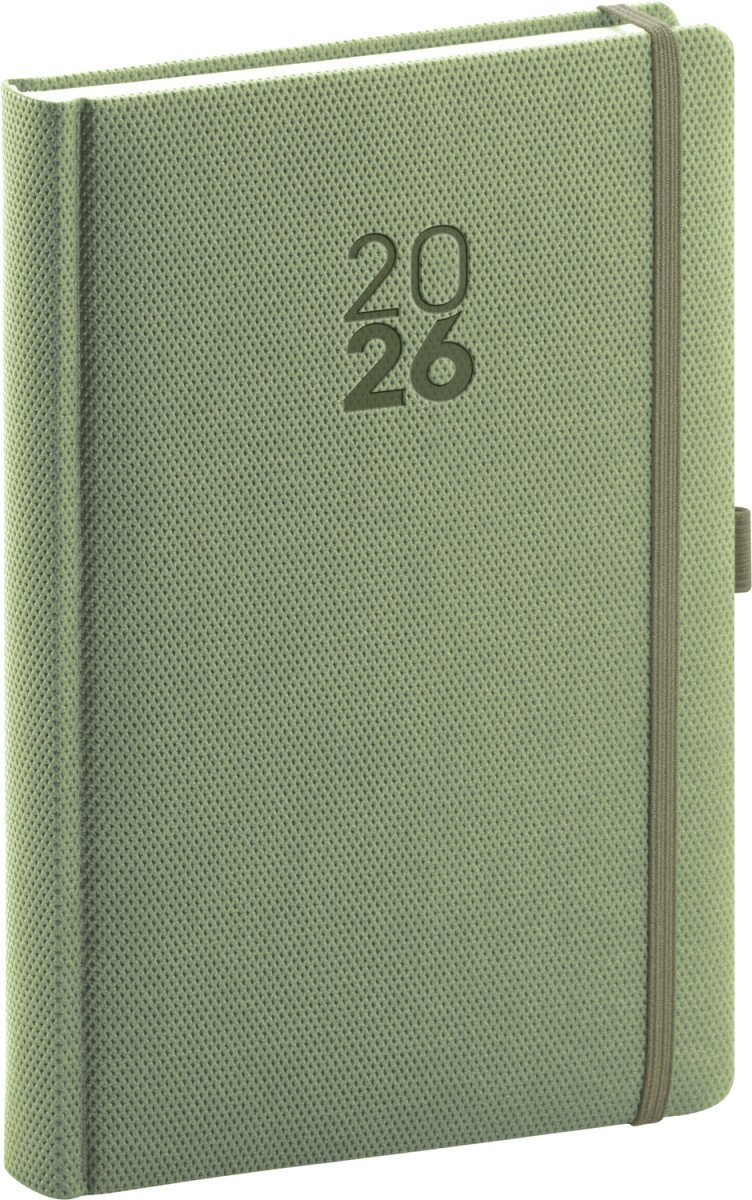 Daily diary Diamante 2026 in olive color. The surface of the diary has a fine texture resembling a diamond cut and is ideal for all types of embossing. The diary has rounded corners, a pen loop, and an elastic band. Daily layout with a Czech-Slovak calendar and additional English, German, Hungarian, and Russian.