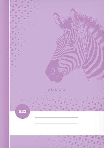 School lined notebook in A5 format, in purple color, featuring a zebra motif, with covers made of coated paper. The pages are borderless.