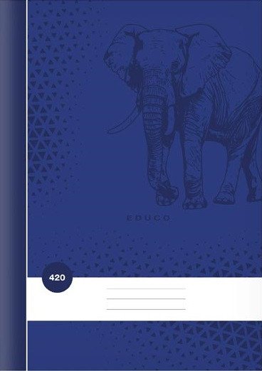 A clean school notebook, without lines, in A4 format, in dark blue color, with an elephant motif, in covers made of coated paper.