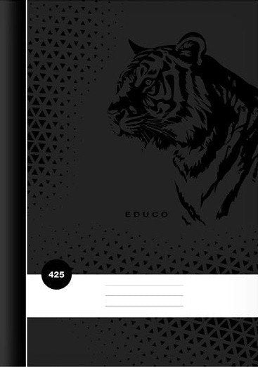 School notebook in A4 format, squared, black color, featuring a tiger design, with covers made of coated paper.