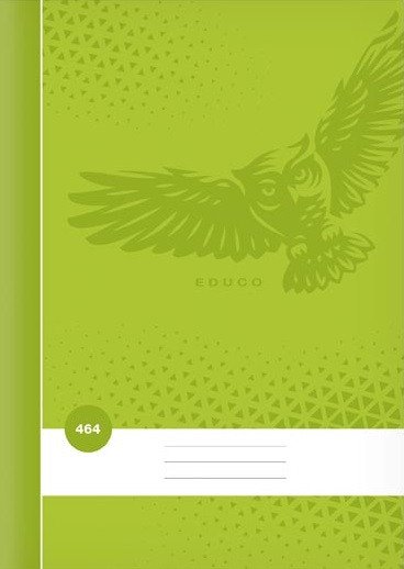 School lined notebook in A4 format, in green color, with an owl motif, in covers made of coated paper. The pages are bordered with a width of 1.5 cm.