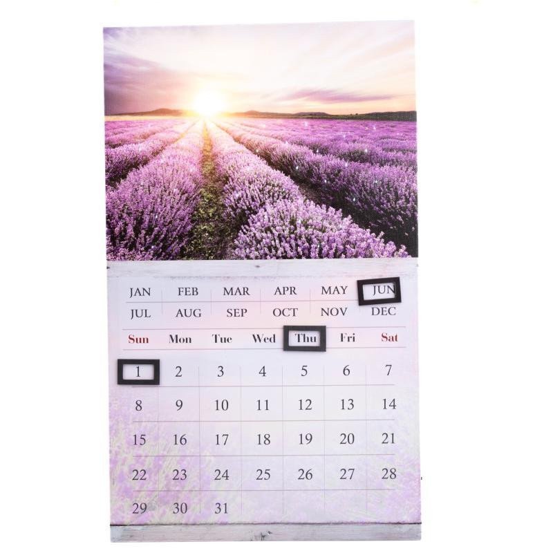 A wall calendar with three magnetic windows displaying the current month and day. The calendar is decorated with a popular lavender motif. Material: canvas on a wooden frame. Dimensions: 30 x 50 x 2 cm
