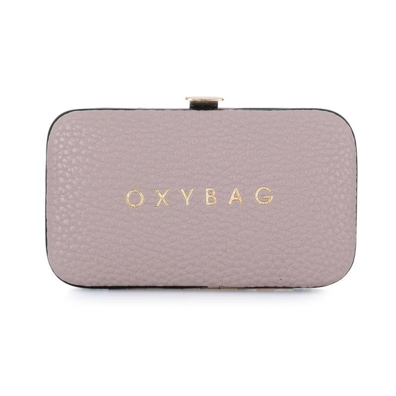 Travel manicure set 6 pcs in mocha design. The silver set includes scissors, nail clippers, an angled tweezer, a file, a manicure stick, and a cuticle pusher. Ideal size for a handbag or travel.
