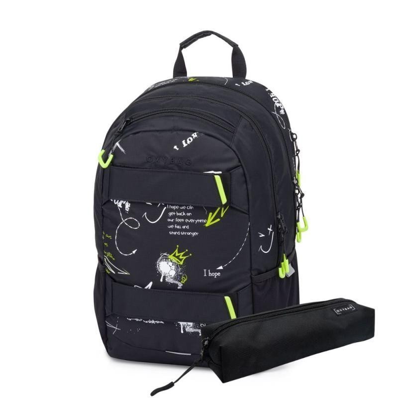 A great set of a backpack and a student pencil case. Backpack: The OXY SPORT series backpack is designed for both students and leisure activities, featuring ergonomically shaped back, adjustable padded shoulder straps, and a chest strap for comfortable carrying. The backpack consists of two main compartments and one smaller front pocket, all equipped with sturdy zippers and practical loops. Inside the backpack, there is a reinforced laptop pocket, a key carabiner, a smaller pocket for small items, and a hidden pocket on the back. It also includes a side pocket for a water bottle and a range of reflective elements for better visibility. The backpack is ideal for both middle school students and for leisure activities for students and adults. The length of the back panel is 46 cm, the volume is 24 l, the weight of the backpack is 870 g, and its load capacity is 8 kg. Pencil case: A student pencil case with a practical elastic band and a zip closure.