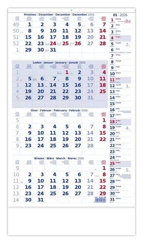 Kalendář nástěnný 2026 - Čtyřměsíční modrý s poznámkami