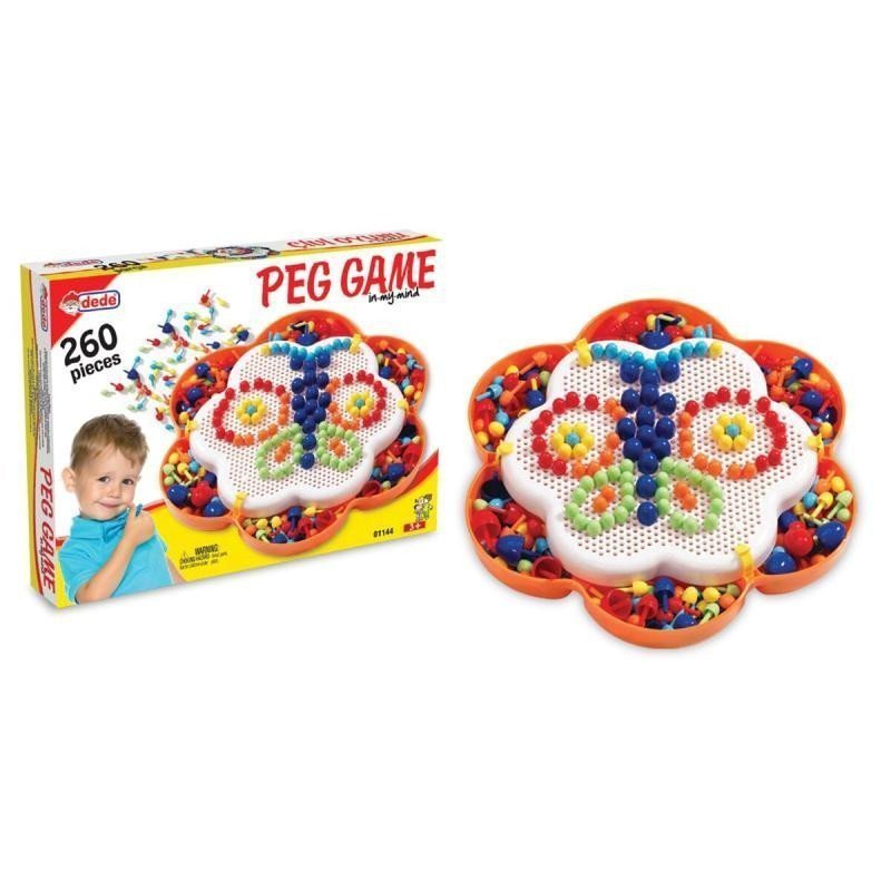The peg game develops children's fine motor skills, creativity, and imagination. The package includes perforated playing boards and 260 colored pegs with heads of various colors, diameters, and shapes. Using these pegs, which fit into the holes in the playing board, children create various pictures or patterns. Made from top-quality plastics. The dimensions of the package are 70x380x300.