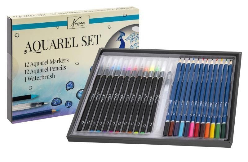 The creative set of watercolor markers and paints will delight all watercolor enthusiasts. The Nassau Fine Art watercolor markers with water-based ink will provide you with a perfect experience for every painting. The marker is suitable for beginners as well as more advanced users. It can be applied to either dry or wet paper. The set also includes a refillable water brush, allowing you to create unique watercolor effects. Drawings made with watercolor paints can be mixed with water, achieving beautiful watercolor paintings. The creative watercolor set includes 12 x watercolor markers, 12 x watercolor paints, and 1 x water brush with a reservoir for beginners and advanced users.