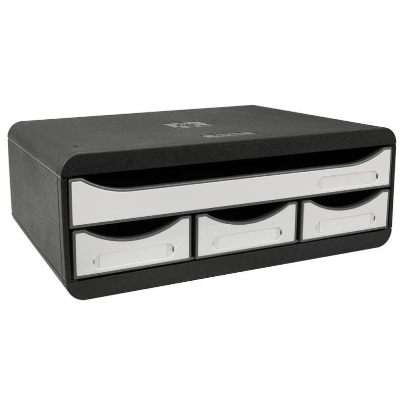The non-standard landscape format allows placement in narrow spaces, cabinets, shelves, or under a PC monitor. Clear storage of documents and small office supplies thanks to spacious drawers. Describable labels. For A4 maxi format. Inserting A4 with the longer side. Material: PS, recycled plastic – Blue Angel certified. Lightweight, durable, stackable. 25-year warranty.