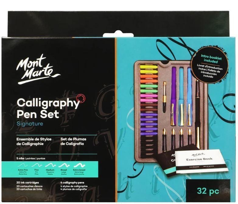 Calligraphy set - 4 calligraphy pens, 5 nibs (extra fine, fine, medium, broad, and extra broad), 20 ink cartridges (2x brown, green, pink, orange, and yellow, 5x black and blue), ink pen pump, brochure on calligraphy, exercise book (p