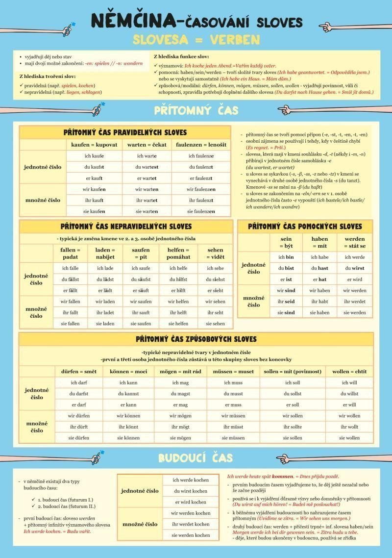 This laminated card is primarily intended for elementary and high school students and offers a visually clear and concise overview of the conjugation of German verbs. Here you will find an overview of all endings and rules in all persons in various tenses.