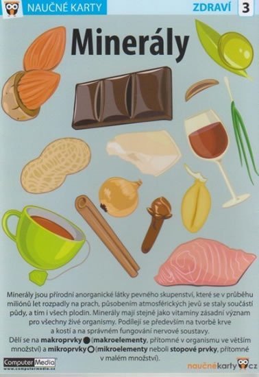 The same applies to minerals as to vitamins – they are essential for the functioning of the organism. The overview of minerals has a similar structure to the section on vitamins: a list of elements, their roles, sources, recommended daily allowances, etc., all supplemented with nice and easily memorable illustrations. Educational cards are a modern way of learning for all generations. They provide a concise, precise, and interesting overview of the most important information from both professional and hobbyist fields. Not only texts but also illustrative images and photographs, thoughtful graphic design, and a practical format will appeal to those who want to educate themselves as well as have fun.
