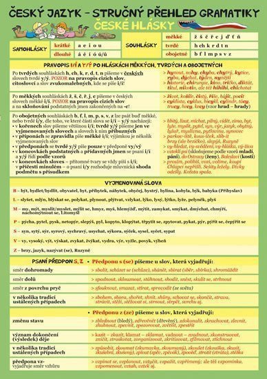 The laminated puzzle designed primarily for elementary and secondary school students offers a visually clear and concise overview of Czech grammar. It includes practical guides on writing i/y, s/z, ú/ů, mě/mně, along with examples, a list of specified words, descriptions and divisions of individual parts of speech, declension of nouns and adjectives, pronouns and numerals, conjugation of verbs, a basic overview, and identification of sentence members and main and subordinate clauses.